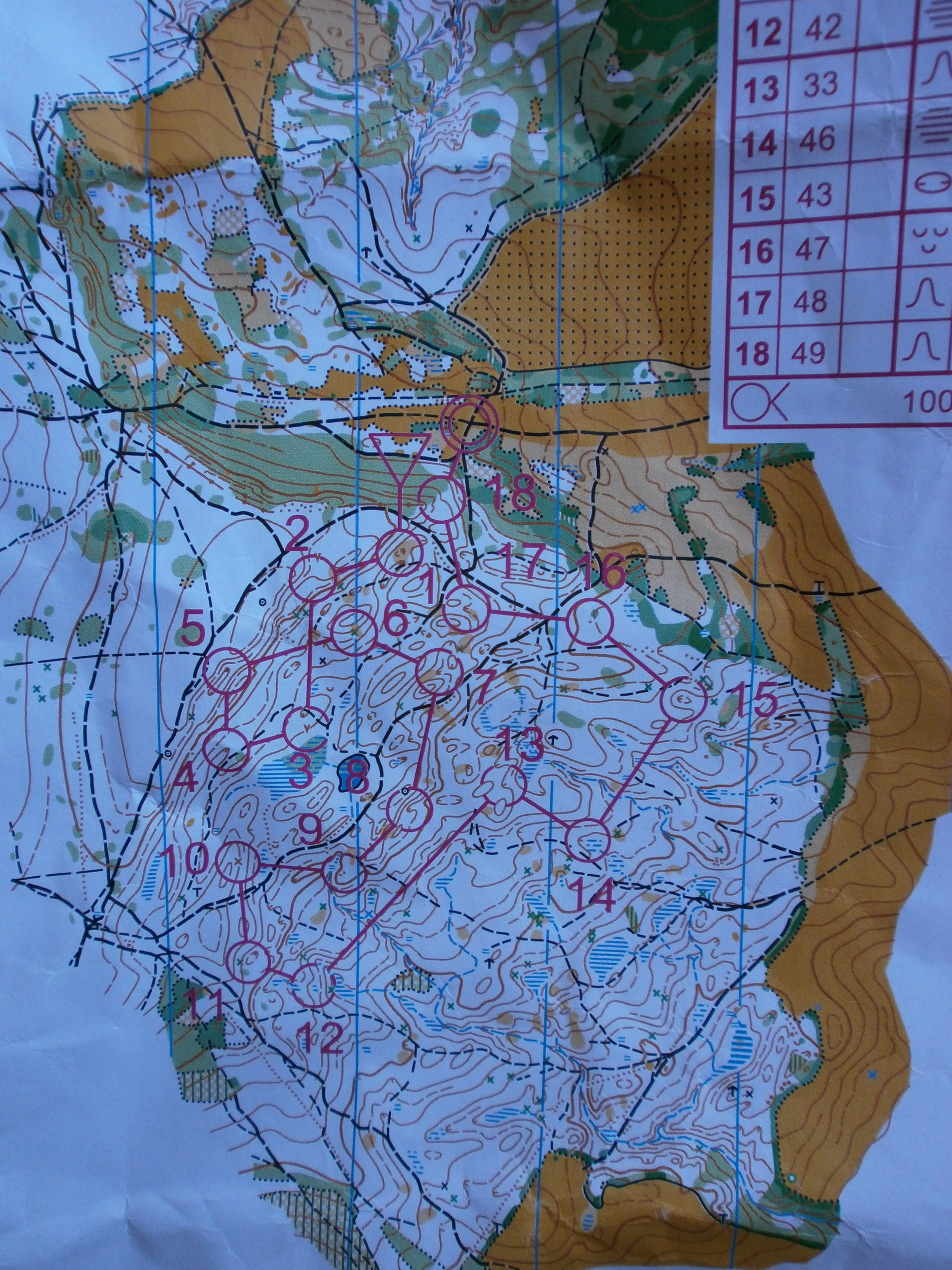 Целью было познакомиться с местностью и ни в коем случае не перенапрягаться. Бегали по довольно плоской вершине горы. Мне она сначала напомнила Ангарский Перевал, но после я сменила свое мнение это, конечно же, Польша, Чемпионат прошлого года. Очень похоже (карта)